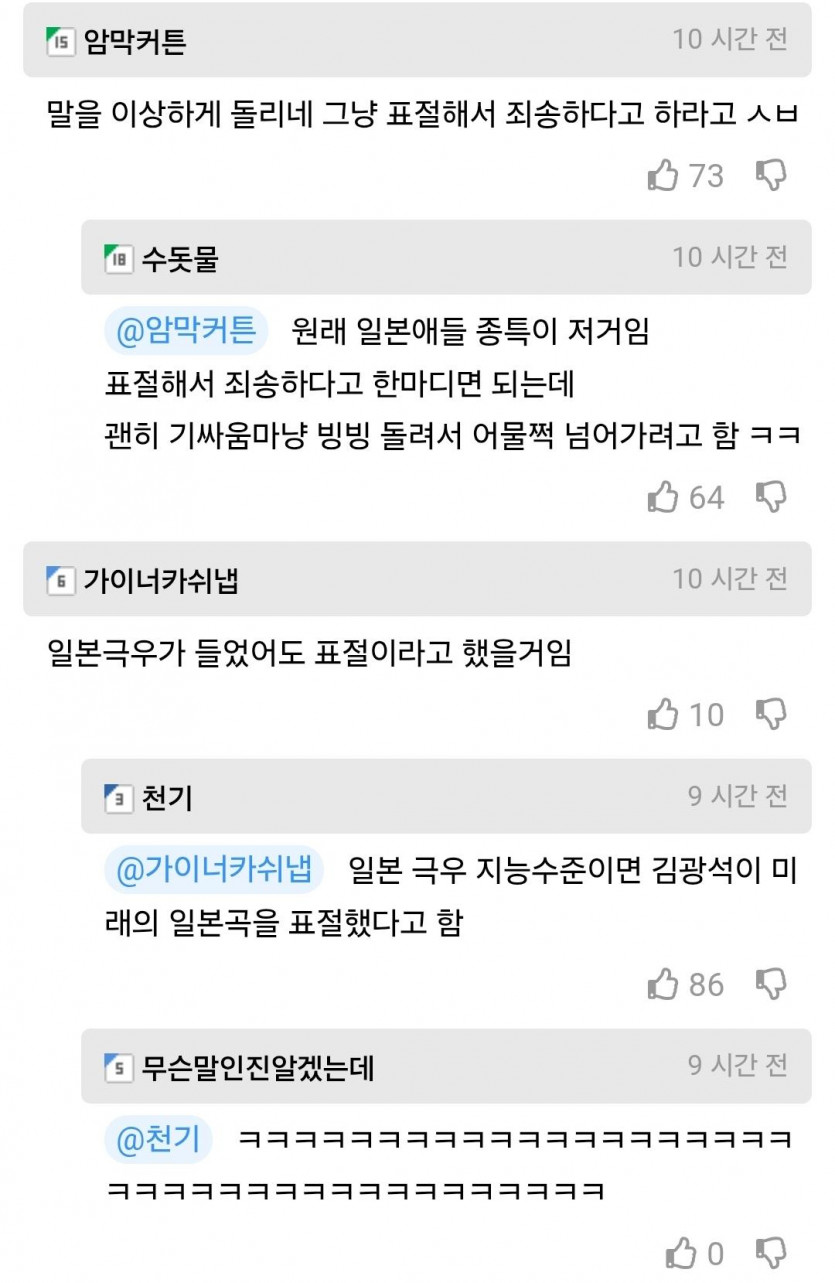 잡식 분류 倭 밴드, 故 김광석 유사성 논란 신곡 철회…“韓에 얼마나 소중한지 알게됐다” 작성자 정보 황웅 쪽지보내기 자기소개 아이디로 검색 전체게시물 쪽지보내기 자기소개 아이디로 검색 전체게시물 작성 작성일 2025.10.03 23:06 컨텐츠 정보 65 조회 0 추천 0 비추천 목록 본문 문화라는 것도 위에서 아래로 흐르는 법이지왜구 원숭이는 잘못을 인지하지 못합니다. 그냥 몽둥이로 패면 알아듣습니다. 0 추천 0 비추천 SNS 공유 신고 관련자료 서명 날으는 황웅 댓글 0 등록된 댓글이 없습니다. 로그인한 회원만 댓글 등록이 가능합니다. 목록