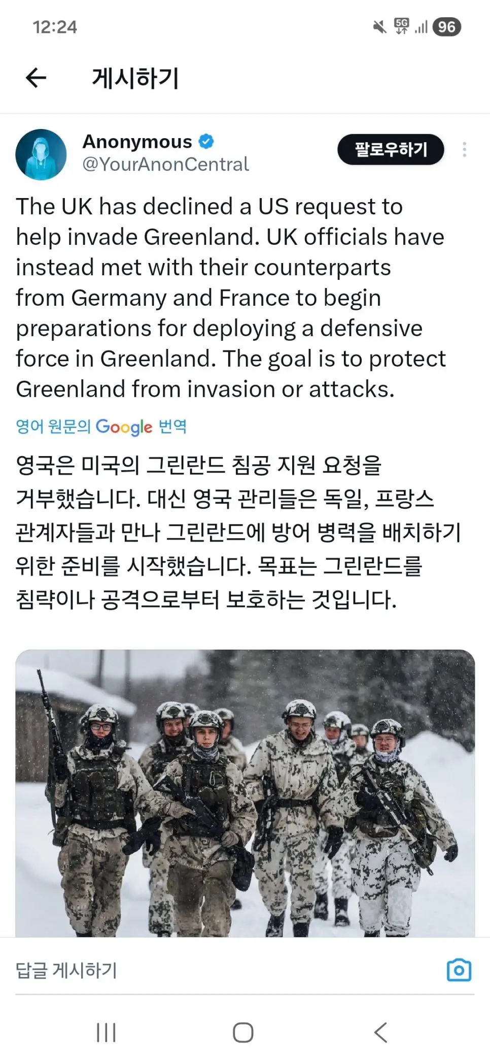 그린란드에 미국으로부터 침공 방어 목적 독영프 병력 배치 준비