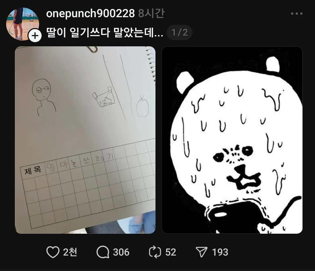 유머 분류 딸이 쓰다 만 일기를 본 엄마 작성자 정보 황웅 쪽지보내기 자기소개 아이디로 검색 전체게시물 쪽지보내기 자기소개 아이디로 검색 전체게시물 작성 작성일 2025.11.15 05:59 컨텐츠 정보 2 조회 0 추천 0 비추천 목록 본문 를 버리러 1층에 내려가셨다가 호떡 트럭을 발견하고는 호떡을 사갖고 오셨다. 맛있었다.-그런데 나한테 호떡 하나 주고 호떡 다섯개는 숨겨두고 혼자 드셨다. 엄마는 쓰레기 0 추천 0 비추천 SNS 공유 신고 관련자료 서명 날으는 황웅 댓글 0 등록된 댓글이 없습니다. 로그인한 회원만 댓글 등록이 가능합니다. 목록