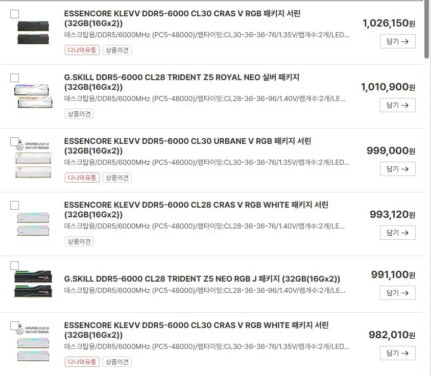 잡식 분류 미쳐버린 램가격 작성자 정보 황웅 쪽지보내기 자기소개 아이디로 검색 전체게시물 쪽지보내기 자기소개 아이디로 검색 전체게시물 작성 작성일 2026.01.01 07:38 컨텐츠 정보 10 조회 2 댓글 0 추천 0 비추천 목록 본문 백만돌파올랐다 그러길래 좀 올랐나보다 했더니 ㅎㄷㄷ 0 추천 0 비추천 SNS 공유 신고 관련자료 서명 날으는 황웅 댓글 2 미우님의 댓글 미우 쪽지보내기 메일보내기 자기소개 아이디로 검색 전체게시물 쪽지보내기 메일보내기 자기소개 아이디로 검색 전체게시물 작성일 08:38 퇴사(은퇴)하고 작업용으로 하이닉스 사려고 짱 보고 있었는데 퇴사 즈음 좀 요동을 쳐서 간 보다 기회를 놓쳤는데 비록 마이크론이지만 지난달 말에 한창 오르는 와중에 예전 가격으로 어느 정도 구입해서 다행 2-3년간 아무 짓도 못할 뻔 신고 추천0비추천0 퇴사(은퇴)하고 작업용으로 하이닉스 사려고 짱 보고 있었는데 퇴사 즈음 좀 요동을 쳐서 간 보다 기회를 놓쳤는데 비록 마이크론이지만 지난달 말에 한창 오르는 와중에 예전 가격으로 어느 정도 구입해서 다행 2-3년간 아무 짓도 못할 뻔 미우님의 댓글 미우 쪽지보내기 메일보내기 자기소개 아이디로 검색 전체게시물 쪽지보내기 메일보내기 자기소개 아이디로 검색 전체게시물 작성일 11:37 찾아보니 아직 32gb 단일 모듈 40만원대네요(이것도 3.5~4배 오른 거) 스샷은 칩 중에 오버 잘 되는 거 골라서 만들어 파는 놈인데 수급 안 좋으니 고를 대상이 적어 저런 건 물량이 극악으로 줄어드니 저런 가격인 거고 신고 추천0비추천0 찾아보니 아직 32gb 단일 모듈 40만원대네요(이것도 3.5~4배 오른 거) 스샷은 칩 중에 오버 잘 되는 거 골라서 만들어 파는 놈인데 수급 안 좋으니 고를 대상이 적어 저런 건 물량이 극악으로 줄어드니 저런 가격인 거고 로그인한 회원만 댓글 등록이 가능합니다. 목록
