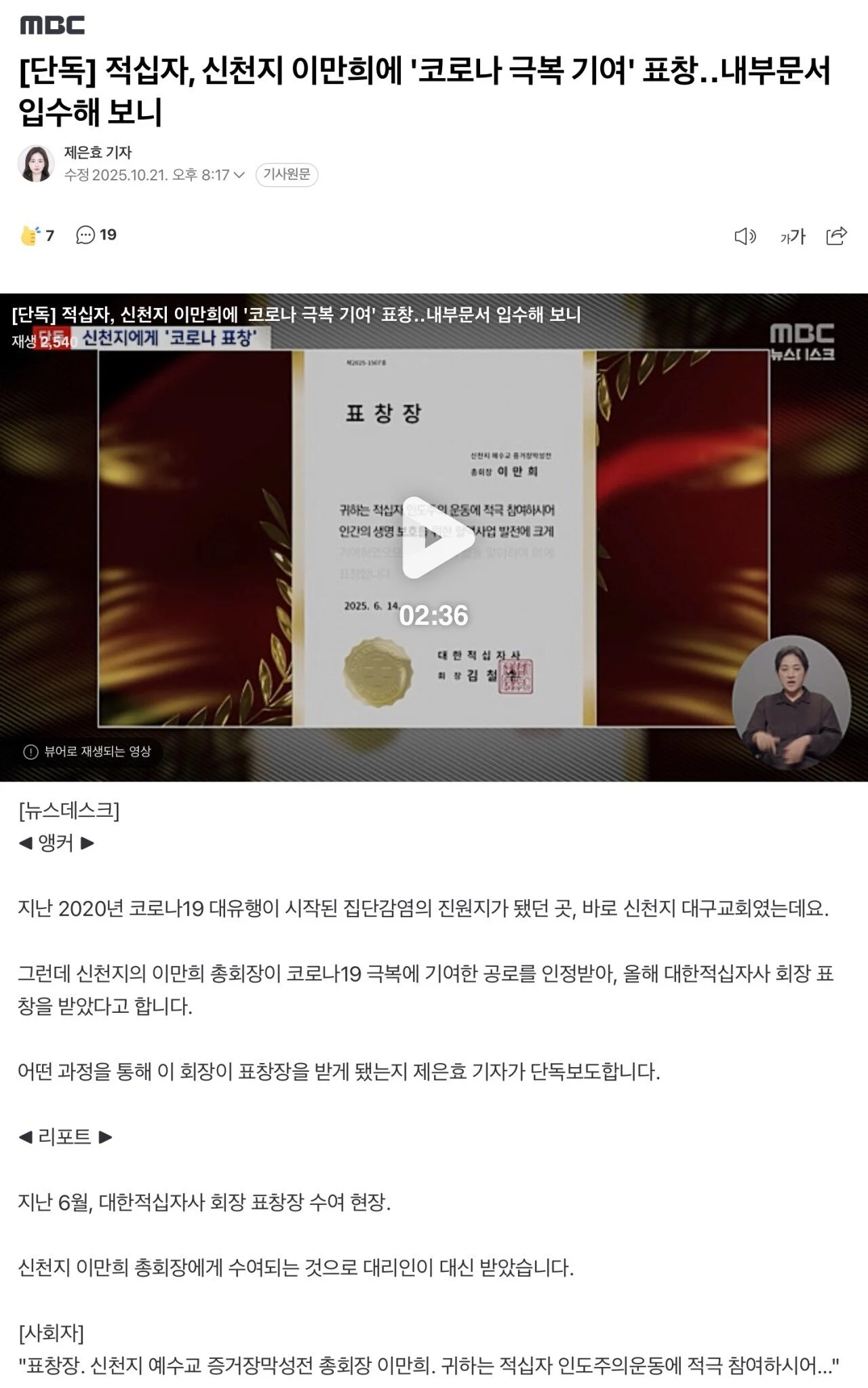 보건복지부 만류에도 이만희한테 표창창 수여한 대한적십자사