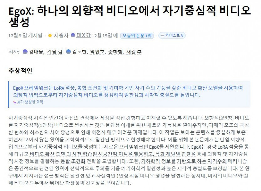 잡식 분류 서울대+카이스트에서 공개한 영상1인칭 AI 작성자 정보 황웅 쪽지보내기 자기소개 아이디로 검색 전체게시물 쪽지보내기 자기소개 아이디로 검색 전체게시물 작성 작성일 2025.12.22 04:44 컨텐츠 정보 229 조회 0 추천 0 비추천 목록 본문 Loading the player... 서울대와 카이스트 연구진들이 만든 AI 프레임워크 EgoX,3인칭 동영상을 1인칭 시점으로 변경해줌 0 추천 0 비추천 SNS 공유 신고 관련자료 서명 날으는 황웅 댓글 0 등록된 댓글이 없습니다. 로그인한 회원만 댓글 등록이 가능합니다. 목록