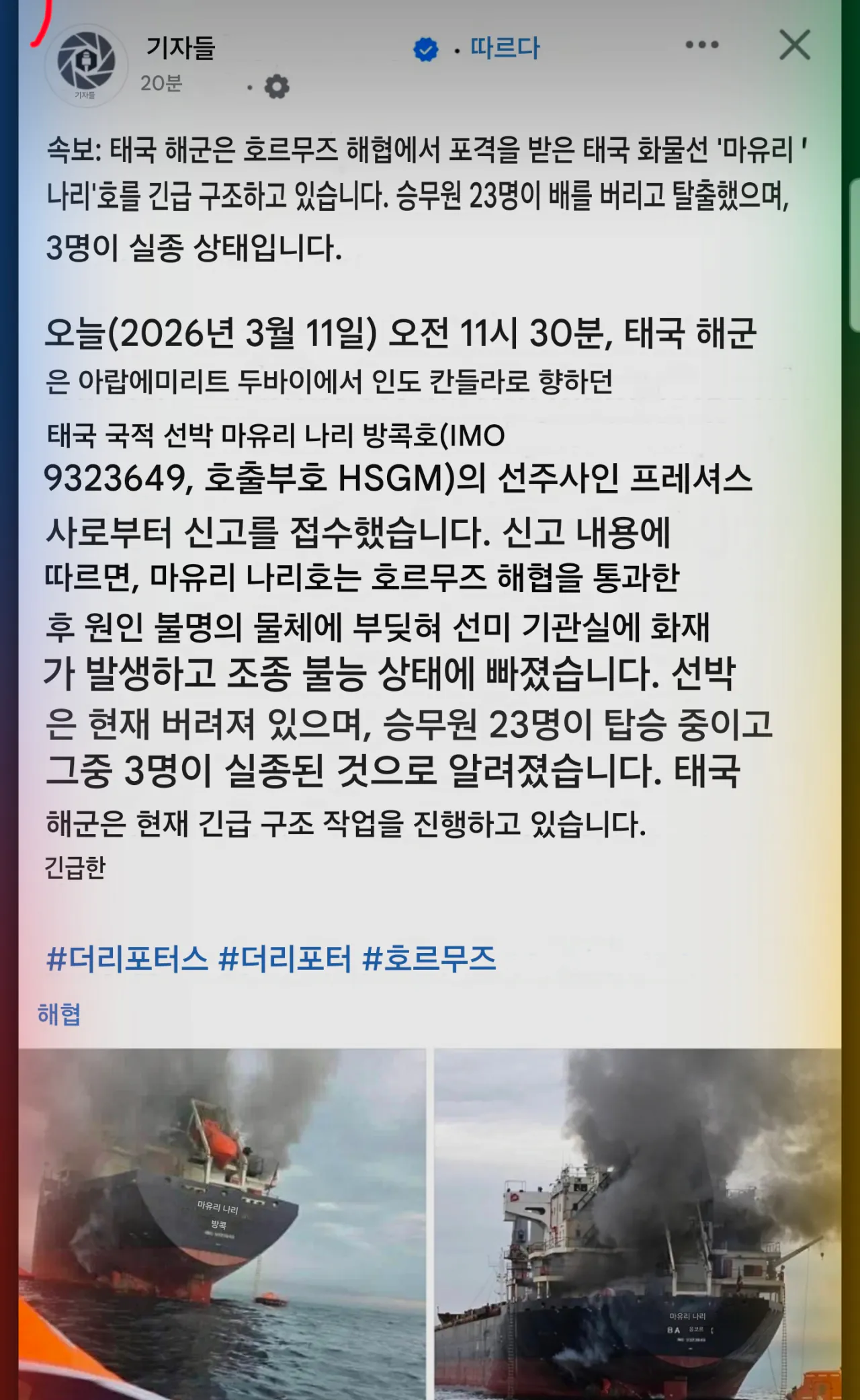 잡식 분류 [속보]태국 화물선 호르무즈 해협에서 포격 당함 작성자 정보 황웅 쪽지보내기 자기소개 아이디로 검색 전체게시물 쪽지보내기 자기소개 아이디로 검색 전체게시물 작성 작성일 2026.03.11 23:40 컨텐츠 정보 3 조회 0 추천 0 비추천 목록 본문 호르무즈 해협 통과중 원인 미상의 물체에 폭격당함23명 선원중 3명 실종현재 태국 모든 언론에서 긴급속보로 다루는중아마도 이란 기뢰인듯한데...? 0 추천 0 비추천 SNS 공유 신고 관련자료 서명 날으는 황웅 댓글 0 등록된 댓글이 없습니다. 로그인한 회원만 댓글 등록이 가능합니다. 목록