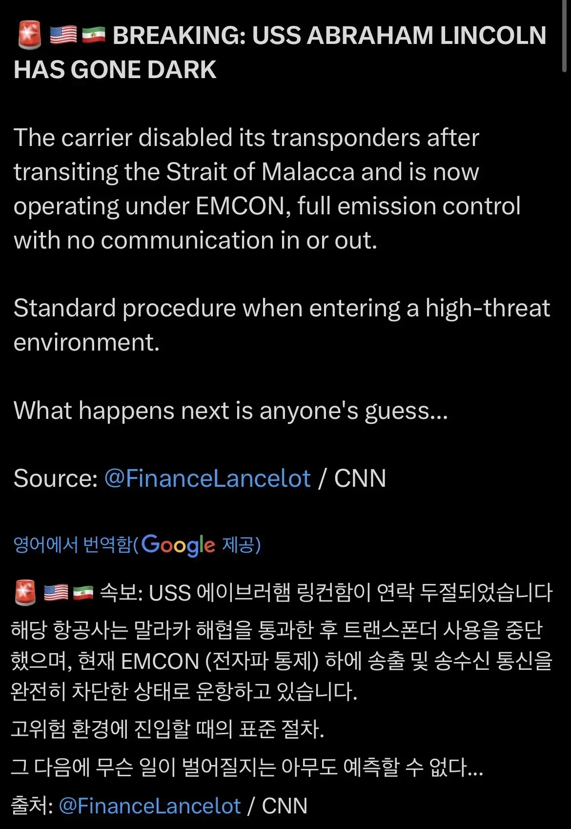 정보 분류 속보) 링컨함 연락두절 작성자 정보 황웅 쪽지보내기 자기소개 아이디로 검색 전체게시물 쪽지보내기 자기소개 아이디로 검색 전체게시물 작성 작성일 2026.01.30 02:16 컨텐츠 정보 108 조회 1 댓글 0 추천 0 비추천 목록 본문 그냥 뭔 작전 중인거 아닌가?미 항공모함을 냅다 깔 수 있는 애가 그 근방에 있을리가 없는데.뭔 뀽꿍이가.... 0 추천 0 비추천 SNS 공유 신고 관련자료 서명 날으는 황웅 댓글 1 미우님의 댓글 미우 쪽지보내기 메일보내기 자기소개 아이디로 검색 전체게시물 쪽지보내기 메일보내기 자기소개 아이디로 검색 전체게시물 작성일 2026.01.30 02:36 잠수... 신고 추천0비추천0 잠수... 로그인한 회원만 댓글 등록이 가능합니다. 목록