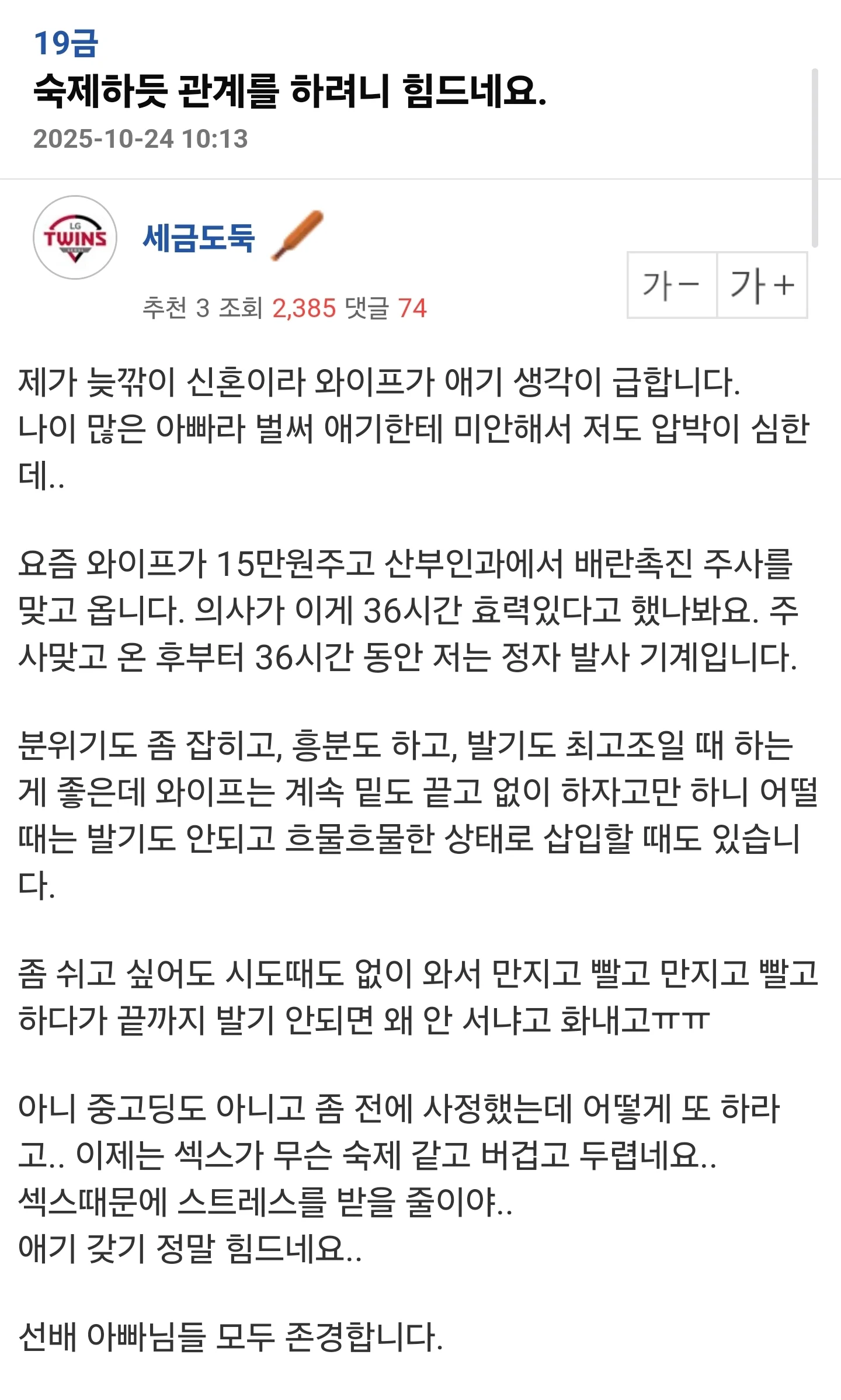 유머 분류 숙제하듯 관계를 하려니 힘드네요. 작성자 정보 황웅 쪽지보내기 자기소개 아이디로 검색 전체게시물 쪽지보내기 자기소개 아이디로 검색 전체게시물 작성 작성일 2025.10.25 01:13 컨텐츠 정보 9 조회 1 댓글 0 추천 0 비추천 목록 본문 종마네 종마...뭐 누군가는 배아픈 얘기겠지만 ㅋㅋㅋ옛날 영화 씨내리가 생각나네 ~ 0 추천 0 비추천 SNS 공유 신고 관련자료 서명 날으는 황웅 댓글 1 미우님의 댓글 미우 쪽지보내기 메일보내기 자기소개 아이디로 검색 전체게시물 쪽지보내기 메일보내기 자기소개 아이디로 검색 전체게시물 작성일 03:57 ??? 어디 아픈가... 하루 12번 정도는 가능하지 않나 신고 추천0비추천0 ??? 어디 아픈가... 하루 12번 정도는 가능하지 않나 로그인한 회원만 댓글 등록이 가능합니다. 목록