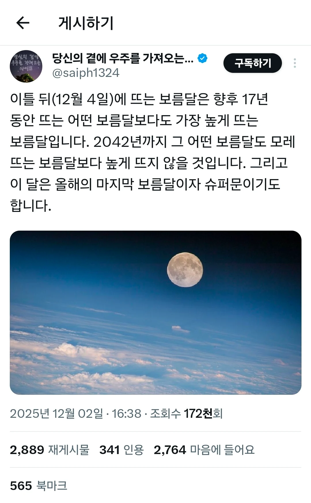 정보 분류 오늘 보름달을 챙겨봐야하는 이유 작성자 정보 황웅 쪽지보내기 자기소개 아이디로 검색 전체게시물 쪽지보내기 자기소개 아이디로 검색 전체게시물 작성 작성일 2025.12.04 16:10 컨텐츠 정보 5 조회 0 추천 0 비추천 목록 본문 0 추천 0 비추천 SNS 공유 신고 관련자료 서명 날으는 황웅 댓글 0 등록된 댓글이 없습니다. 로그인한 회원만 댓글 등록이 가능합니다. 목록