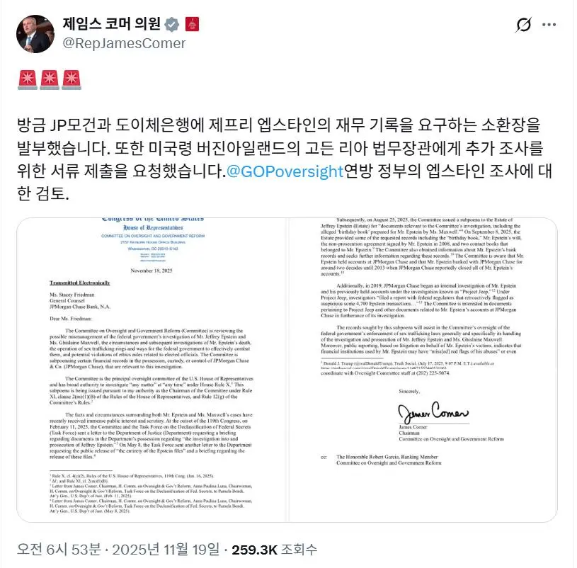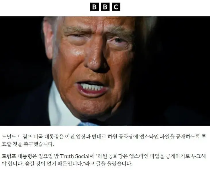 최근 엡스타인 목록에 있다고 의혹을 받던 트럼프 미 대통령이 소극적으로 대응하다가 갑자기 파일공개 시키라고 발언함