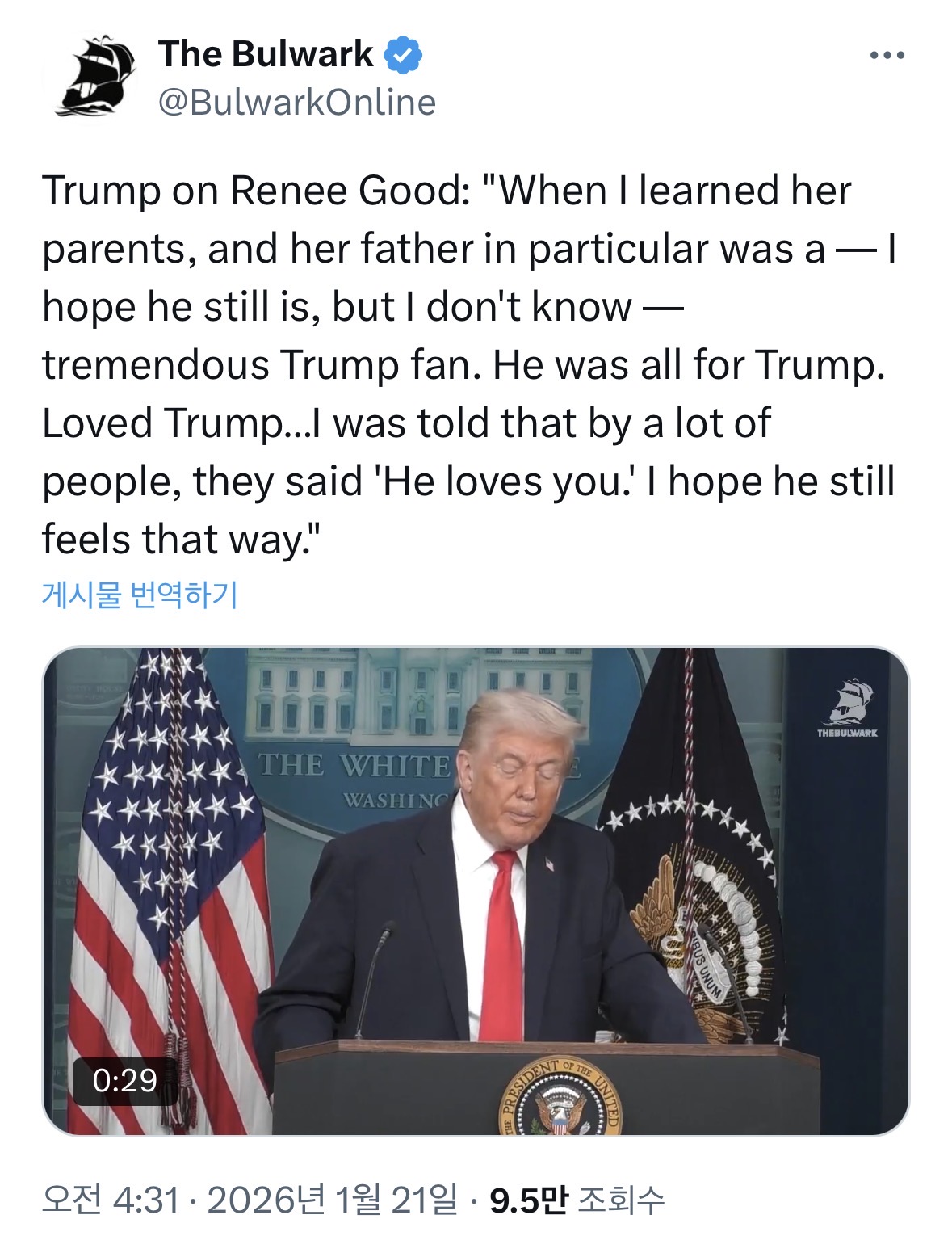 정보 분류 트럼프 “ICE 총격 피해자의 아버지가 여전히 내 지지자이길 바란다” 작성자 정보 황웅 쪽지보내기 자기소개 아이디로 검색 전체게시물 쪽지보내기 자기소개 아이디로 검색 전체게시물 작성 작성일 2026.01.22 22:17 컨텐츠 정보 290 조회 0 추천 0 비추천 목록 본문 원수를 사랑하라??? 왜!?지옥이 머지 않았다믹서기로 갈아 죽일 새끼 0 추천 0 비추천 SNS 공유 신고 관련자료 서명 날으는 황웅 댓글 0 등록된 댓글이 없습니다. 로그인한 회원만 댓글 등록이 가능합니다. 목록