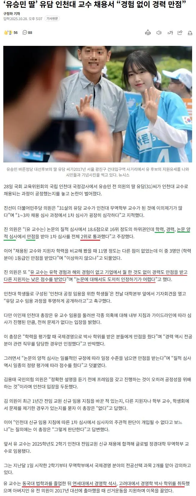 2. 경력은 없지만 아빠 정치를 도운 효녀이므로 경력 만점 받은 인천대 교수 채용