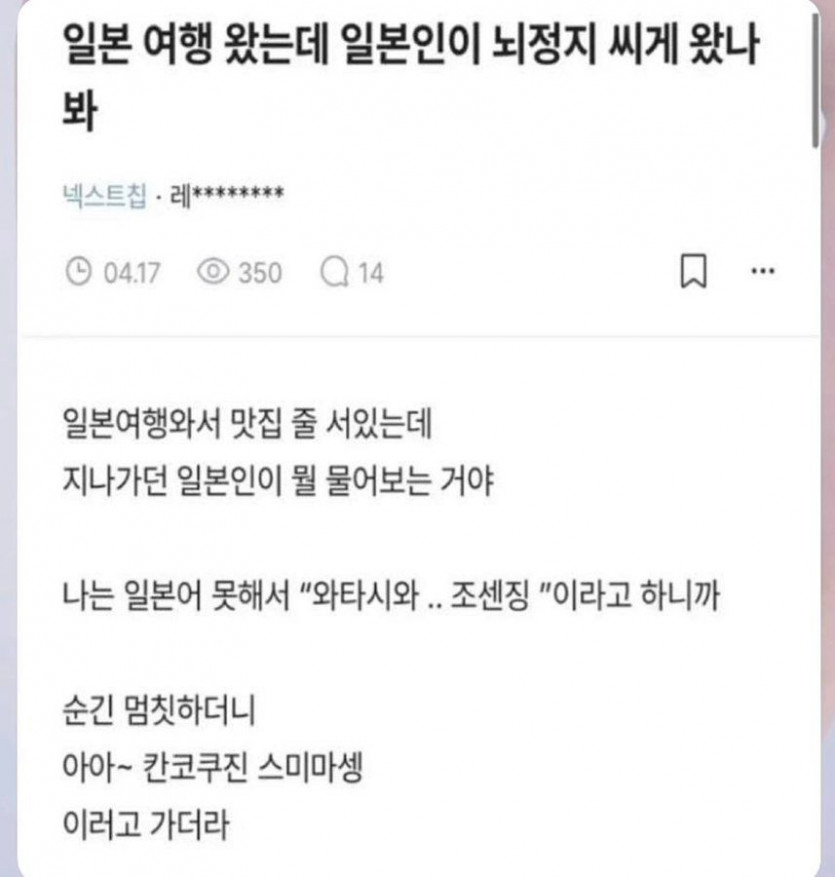 유머 분류 한국인한테 말 걸었다 뇌정지 씨게온 왜인 작성자 정보 황웅 쪽지보내기 자기소개 아이디로 검색 전체게시물 쪽지보내기 자기소개 아이디로 검색 전체게시물 작성 작성일 2026.02.12 21:18 컨텐츠 정보 47 조회 1 댓글 0 추천 0 비추천 목록 관리 글검색 본문 0 추천 0 비추천 SNS 공유 신고 관련자료 서명 날으는 황웅 댓글 1 미우님의 댓글 미우 쪽지보내기 메일보내기 자기소개 아이디로 검색 전체게시물 쪽지보내기 메일보내기 자기소개 아이디로 검색 전체게시물 작성일 02.13 04:02 베충이 새낀가 신고 추천0비추천0 베충이 새낀가 로그인한 회원만 댓글 등록이 가능합니다. 목록 관리 글검색