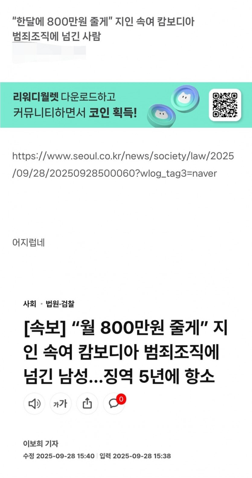 잡식 분류 “한달에 800만원 줄게” 지인 속여 캄보디아 범죄조직에 넘긴 사람 작성자 정보 황웅 쪽지보내기 자기소개 아이디로 검색 전체게시물 쪽지보내기 자기소개 아이디로 검색 전체게시물 작성 작성일 2025.10.03 22:52 컨텐츠 정보 100 조회 0 추천 0 비추천 목록 본문 5년 말고 캄보디아로 보내야함 0 추천 0 비추천 SNS 공유 신고 관련자료 서명 날으는 황웅 댓글 0 등록된 댓글이 없습니다. 로그인한 회원만 댓글 등록이 가능합니다. 목록