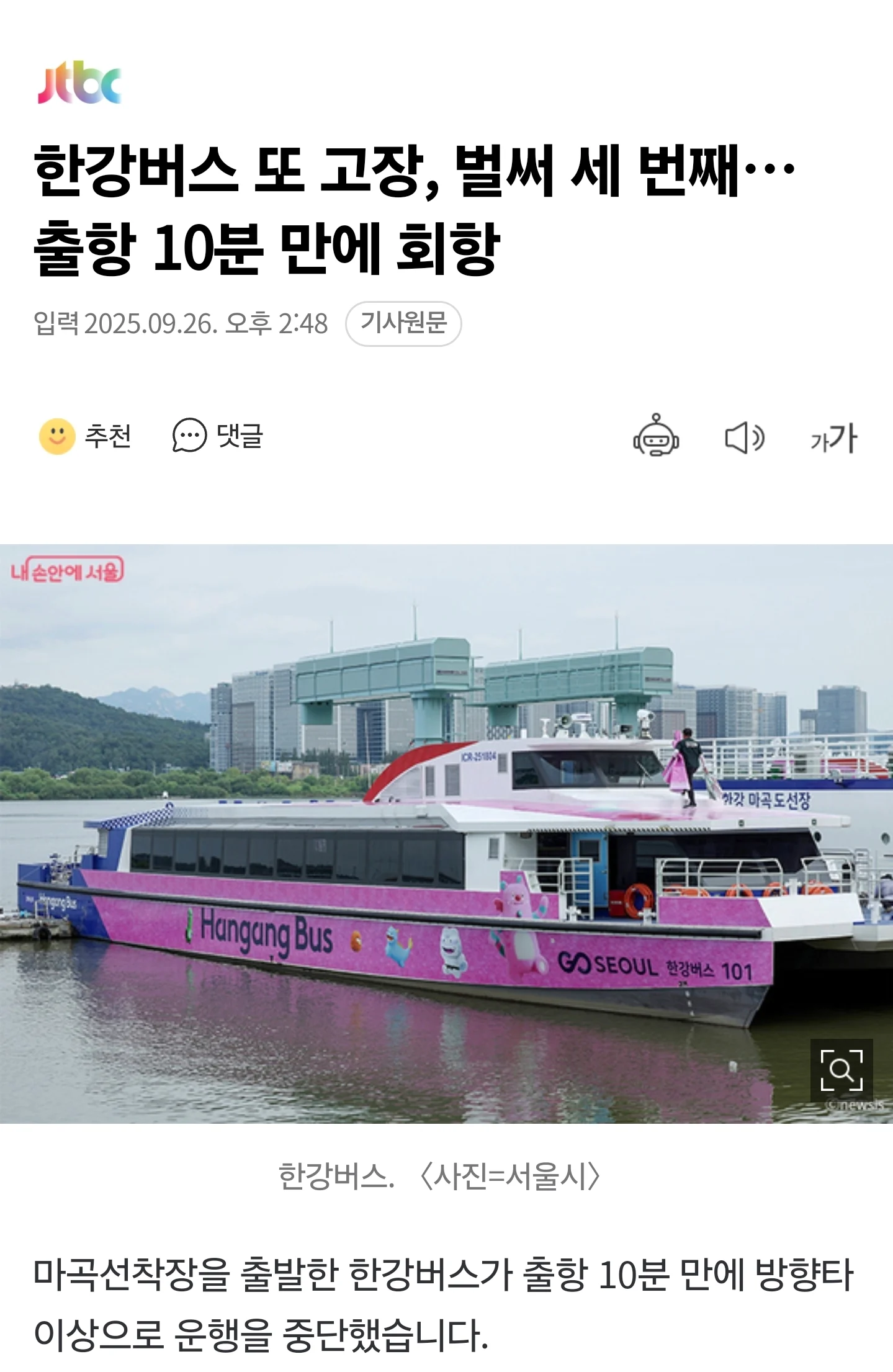 10분만에 회항하는 한강버스...벌써 세번째 고장