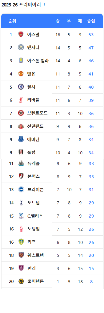 수다 분류 요즘 영국축구 순위 작성자 정보 조은대 쪽지보내기 자기소개 아이디로 검색 전체게시물 쪽지보내기 자기소개 아이디로 검색 전체게시물 작성 작성일 2026.02.06 18:32 컨텐츠 정보 142 조회 1 댓글 0 추천 0 비추천 목록 본문 옛날에는 확실한 5강 맨시티,리버풀,첼시,아스널,맨유가 있었는데요즘에는 승부를 알수가 없네요.손흥민 떠난~~닭트넘이 14위라는 것에 만족감이 듭니다. ㅎㅎ 0 추천 0 비추천 SNS 공유 신고 관련자료 댓글 1 미우님의 댓글 미우 쪽지보내기 메일보내기 자기소개 아이디로 검색 전체게시물 쪽지보내기 메일보내기 자기소개 아이디로 검색 전체게시물 작성일 02.06 18:41 이 시키들 어떻게 7승이나 했지 신고 추천0비추천0 이 시키들 어떻게 7승이나 했지 로그인한 회원만 댓글 등록이 가능합니다. 목록