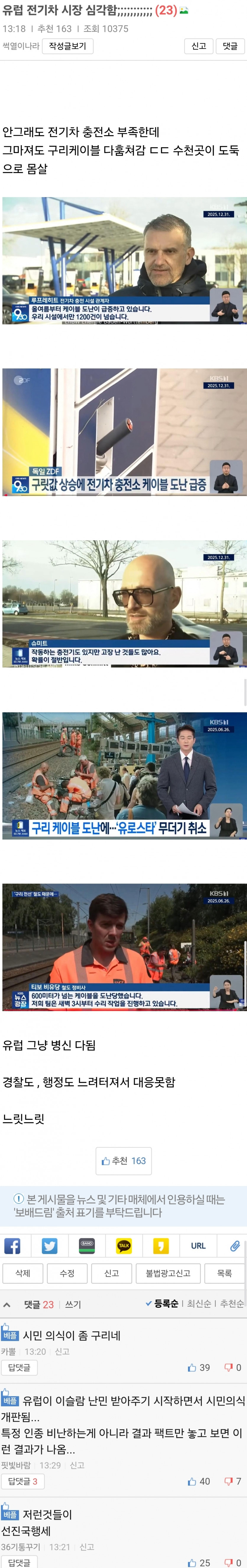 수다 분류 유럽 전기차 충전소 상황 작성자 정보 잠수함 쪽지보내기 자기소개 아이디로 검색 전체게시물 쪽지보내기 자기소개 아이디로 검색 전체게시물 작성 작성일 2026.01.02 18:59 컨텐츠 정보 21 조회 3 댓글 0 추천 0 비추천 목록 본문 그렇지 않아도유럽산 자동차 회사 전기차 기술력 부족으로 고전하고 있는데인프라 자체 설치도 제대로 못한다는...ㅋㅋㅋㅋㅋㅋㅋㅋ웃기긴 웃기네요@@/ 0 추천 0 비추천 SNS 공유 신고 관련자료 서명 물속에서 꼬르륵 ~~~~ 댓글 3 바야바라밀님의 댓글 바야바라밀 쪽지보내기 메일보내기 자기소개 아이디로 검색 전체게시물 쪽지보내기 메일보내기 자기소개 아이디로 검색 전체게시물 작성일 01.02 19:23 식민 제국주의 시대 배부르고 따숩게 살았으니 이제 힘들어질 때도 되었지. 신고 추천0비추천0 식민 제국주의 시대 배부르고 따숩게 살았으니 이제 힘들어질 때도 되었지. KingCrab님의 댓글 KingCrab 쪽지보내기 메일보내기 자기소개 아이디로 검색 전체게시물 쪽지보내기 메일보내기 자기소개 아이디로 검색 전체게시물 작성일 01.02 19:28 인과응보 신고 추천0비추천0 인과응보 미우님의 댓글 미우 쪽지보내기 메일보내기 자기소개 아이디로 검색 전체게시물 쪽지보내기 메일보내기 자기소개 아이디로 검색 전체게시물 작성일 01.02 20:03 우리 나라 IMF 때 전선 훔쳐가고 가드레일 훔쳐가고 했었는데 저것들 곧 IMF 처맞으려나 보네 신고 추천0비추천0 우리 나라 IMF 때 전선 훔쳐가고 가드레일 훔쳐가고 했었는데 저것들 곧 IMF 처맞으려나 보네 로그인한 회원만 댓글 등록이 가능합니다. 목록