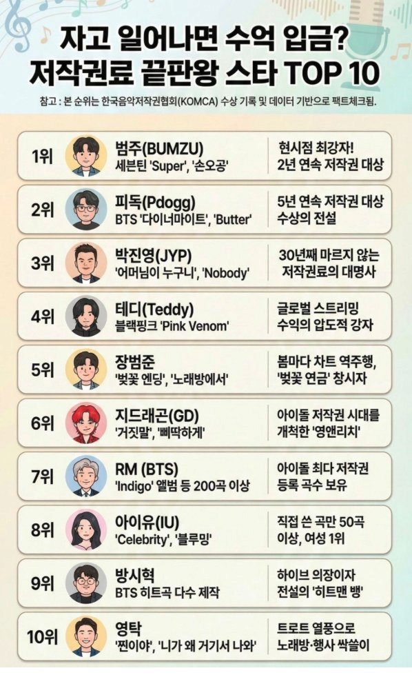 연예 분류 국내 음원 저작권료 수익 TOP 10 작성자 정보 황웅 쪽지보내기 자기소개 아이디로 검색 전체게시물 쪽지보내기 자기소개 아이디로 검색 전체게시물 작성 작성일 2026.01.22 00:46 컨텐츠 정보 1,473 조회 0 추천 0 비추천 목록 본문 0 추천 0 비추천 SNS 공유 신고 관련자료 서명 날으는 황웅 댓글 0 등록된 댓글이 없습니다. 로그인한 회원만 댓글 등록이 가능합니다. 목록