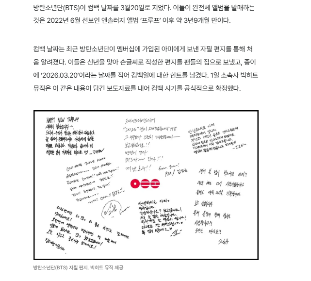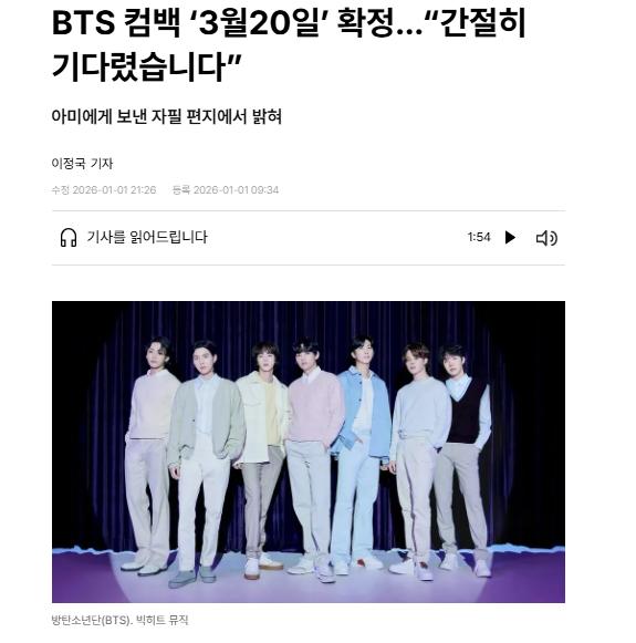 연예 분류 BTS 3월 20일 컴백 작성자 정보 황웅 쪽지보내기 자기소개 아이디로 검색 전체게시물 쪽지보내기 자기소개 아이디로 검색 전체게시물 작성 작성일 2026.01.02 02:12 컨텐츠 정보 3 조회 0 추천 0 비추천 목록 관리 글검색 본문 https://www.hani.co.kr/arti/culture/music/1237522.html3월20일은 BTS 컴백 소삭이 무조건 1면 뉴스겠네요 0 추천 0 비추천 SNS 공유 신고 관련자료 서명 날으는 황웅 댓글 0 등록된 댓글이 없습니다. 로그인한 회원만 댓글 등록이 가능합니다. 목록 관리 글검색