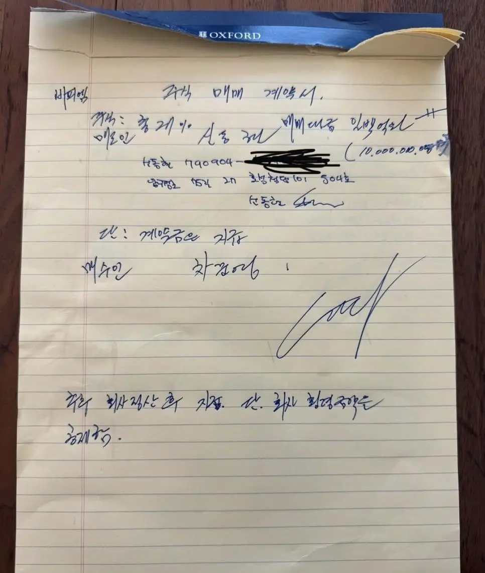 한 주주명부 와 주식양도 매매 계약서 차준영 자필 계약서 입니다.